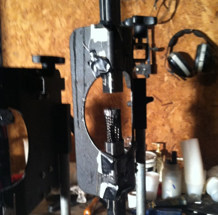 The two pieces of shaft are aligned in a custom manufactured clamp, and then a specially designed Styrofoam piece is lodged in the bottom section of the shaft (approx. 1.5 inches down). Acarbon fiber Aircore sleeve™ (which is approx. 3 inches in length comprised of 2 layers of carbon fiber surrounding a foam centre) is then inserted into the hollow of the bottom piece of the stick until it reaches the Styrofoam. The top section of the stick is placed over the Aircore Sleeve, re-aligned, clamped together, and taped (to deter epoxy leakage).